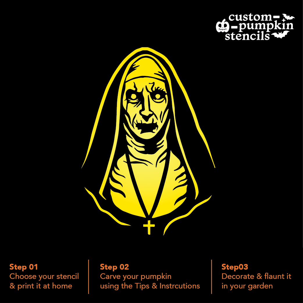 Simply download and print out the stencil, then carefully cut along the lines to create the nun design. Once you’ve carved out the design on your pumpkin, light it up with a candle or LED light to bring your creation to life.